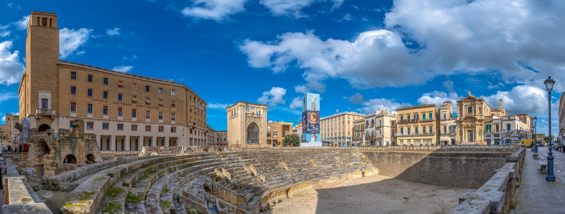 Una parada clave en el recorrido es la Porta Napoli, un gran arco triunfal construido en 1548 en honor a Carlos V, que marca la entrada al casco antiguo. Otro lugar imprescindible es la Basílica de Santa Croce, una obra maestra barroca adornada con intrincadas tallas de querubines, animales y figuras mitológicas. Cerca se encuentra el Castillo de Carlos V, construido en el siglo XVI, que fue una fortaleza defensiva y más tarde una prisión. Su imponente estructura refleja la importancia estratégica de Lecce durante el reinado de Carlos V, y hoy alberga exposiciones y eventos culturales. El recorrido también conduce a la Piazza Sant'Oronzo, el corazón de Lecce, donde la estatua del patrón de la ciudad se erige orgullosamente sobre una columna romana. Esta vibrante plaza ha sido un lugar de encuentro durante siglos, con una mezcla de elementos antiguos y modernos que muestran la evolución de Lecce a lo largo del tiempo.